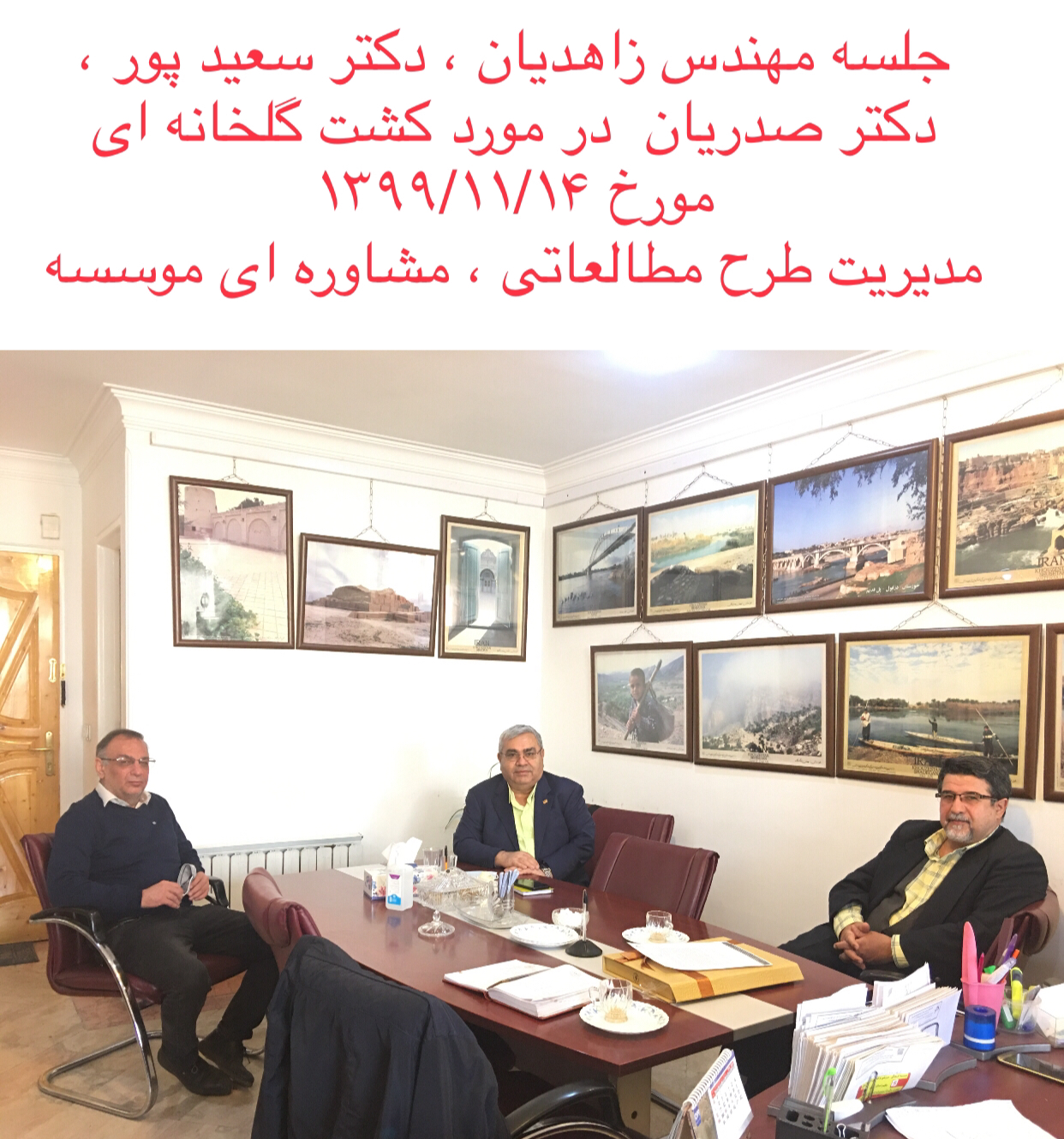 آقایان مهندس محمد رضا زاهدیان ، دکتر بهزاد سعید پور و دکتر منصور صدریان در جلسه هماهنگی و تفاهم نامه همکاری سه جانبه کشت گلخانه ای در محور های مختلف مشاوره ، مطالعه ، نظارت ، آموزش و ترویج و صادرات گلخانه ای بحث و گفتگو گردید