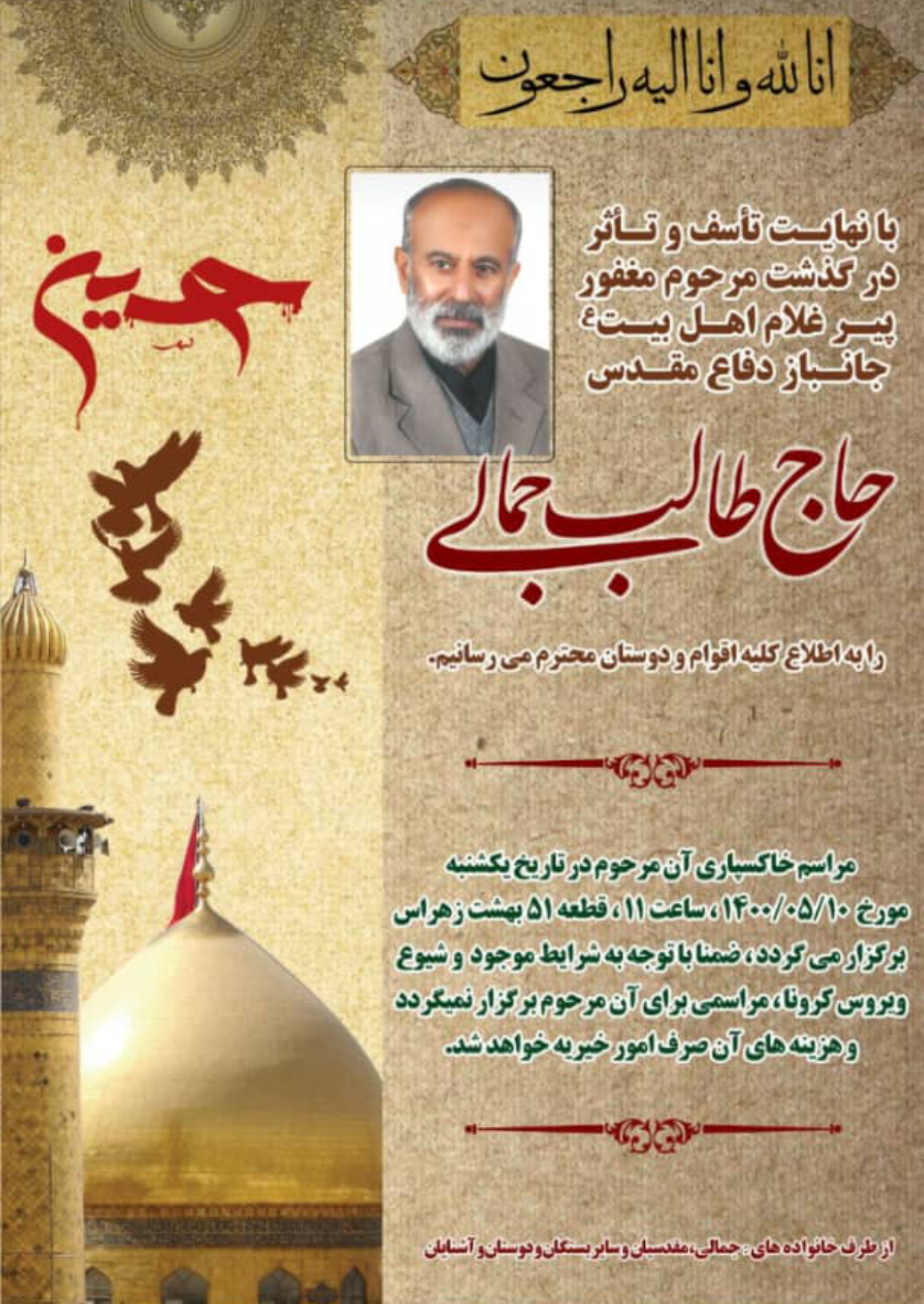 احتراما در گذشت اندوهناک همسر گرامیتان (زنده یاد حاج طالب جمالی، جهادگر و جانباز دفاع مقدس ) را تسلیت عرض مى نمائیم و از خداوند منان رحمت الهى براى مرحوم مغفوره و صبر جمیل براى بازماندگان آرزومندیم ،